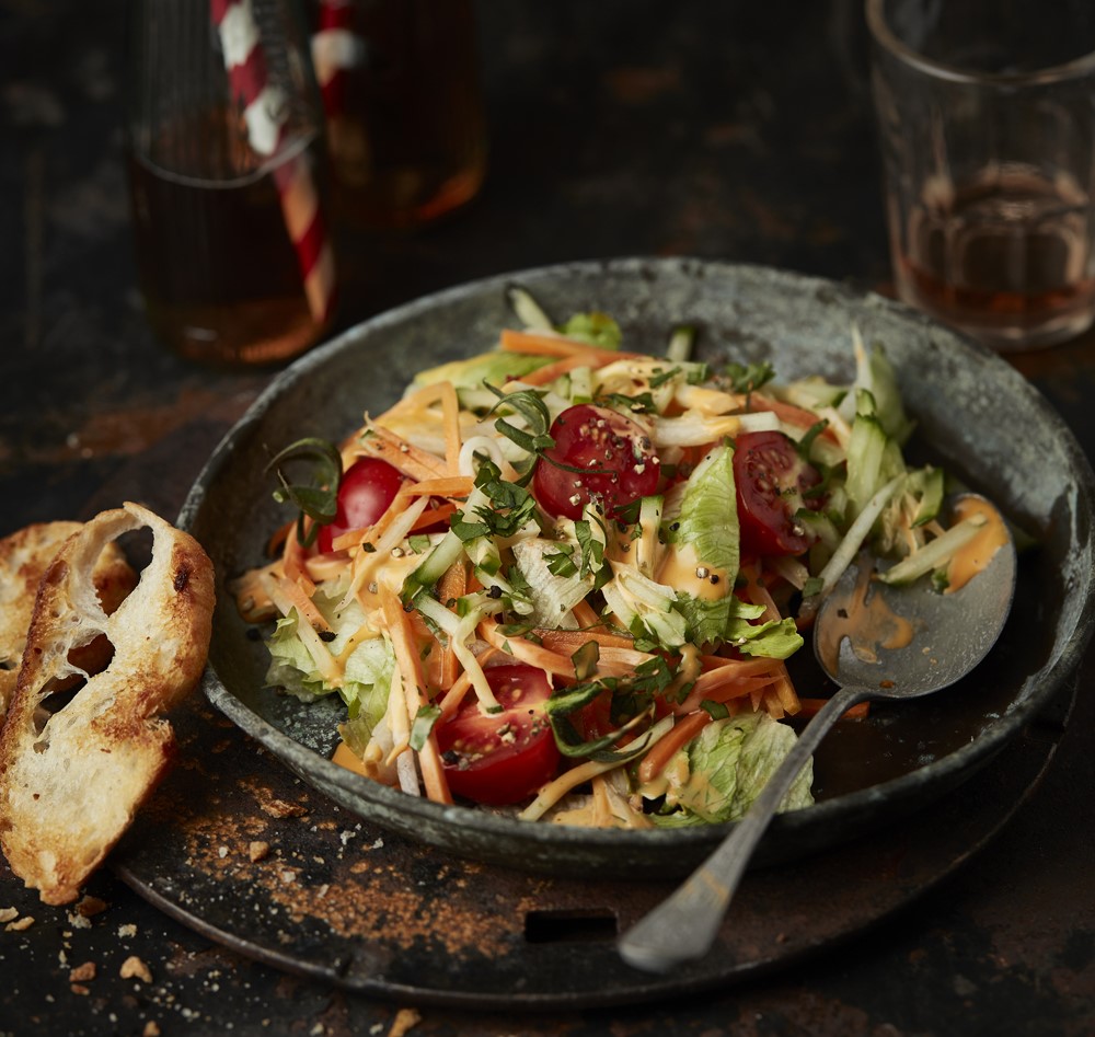 2.) Po cca 5 minútach pridáme natrhaný šalát a nakrájané. Zmiešame s Francúzskym šalátovým dressingom Hellmann’s a podávame.TIP: Môžeme pridať chlebové krutónky (tenké plátky bagety opečené a potreté cesnakom)